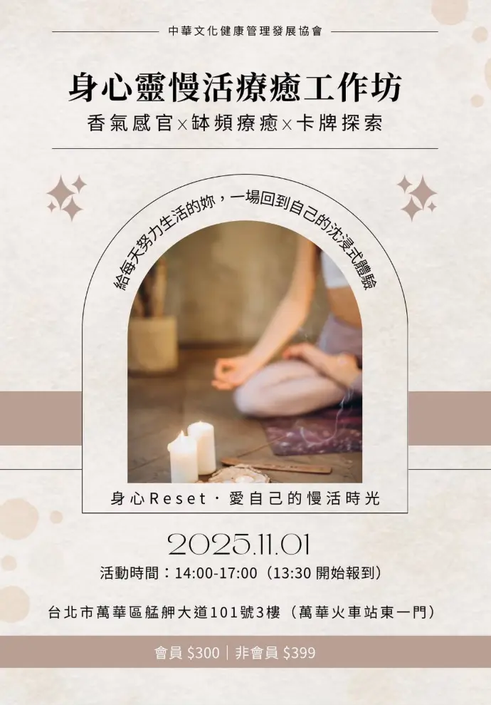 協會特別規劃 「身心靈慢活療癒工作坊」,透過香氣、聲音與直覺卡牌的引導,陪伴您沈澱心緒、傾聽自己,找回內在的平靜能量!