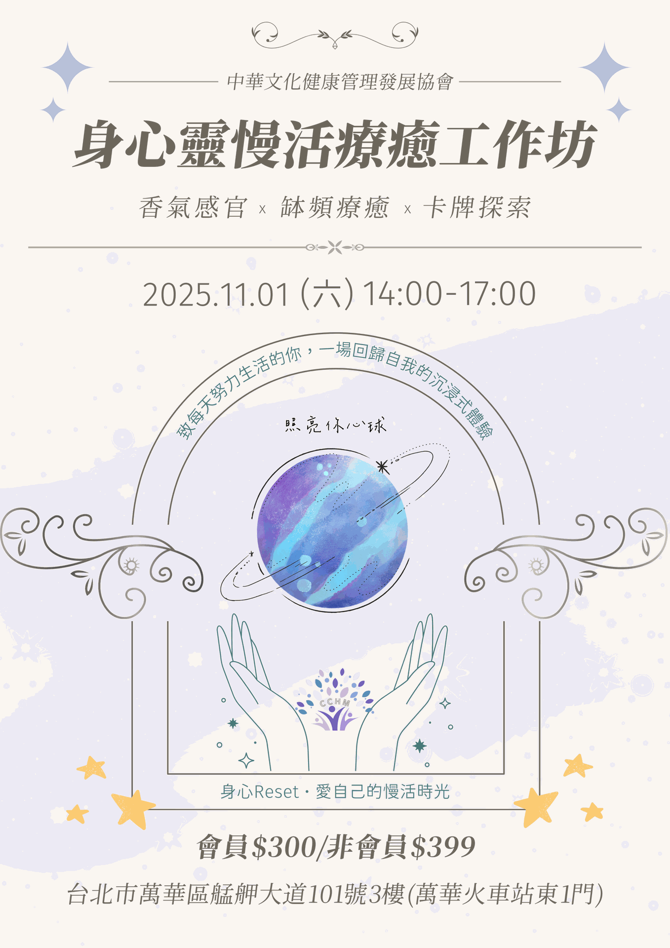 - 費用:會員 $300|非會員 $399(含贈品:精油+心靈小卡)